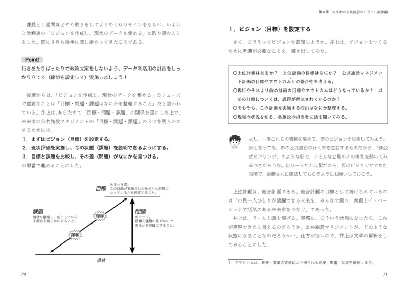 架空の自治体「未来市」を舞台に、若手職員(井上)がデータを根拠に、住民と対話し、合意形成をしながら政策立案していく過程を描きます。